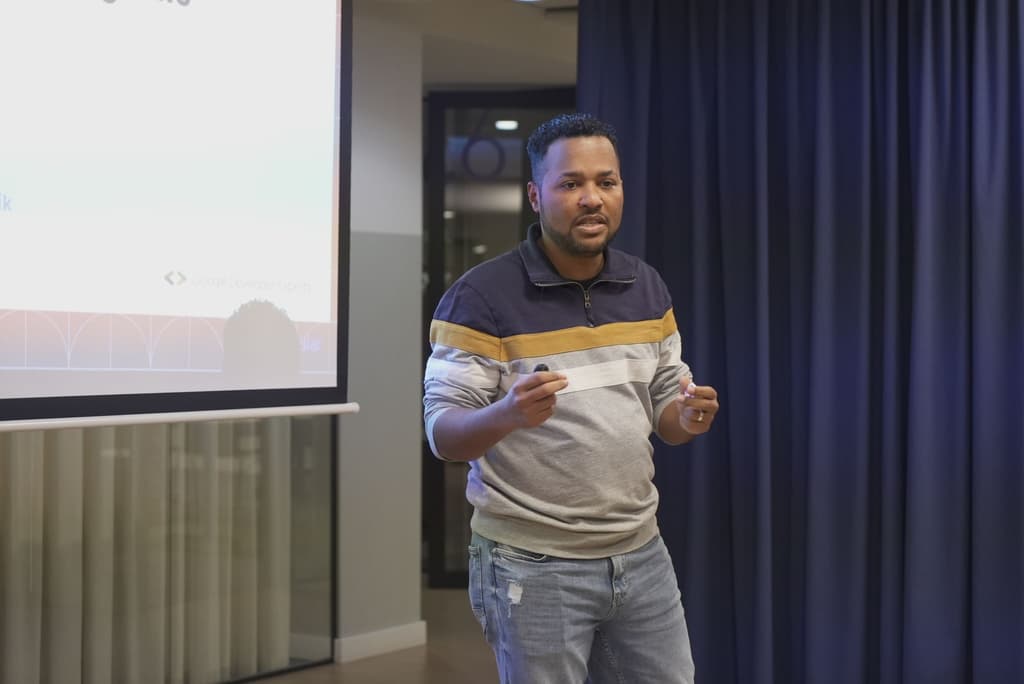 🤖 Tech Talk AI + Frontend with Leifer Mendez in Madrid, demonstrating chatbots built with Gemini, Angular, and Kendo UI.