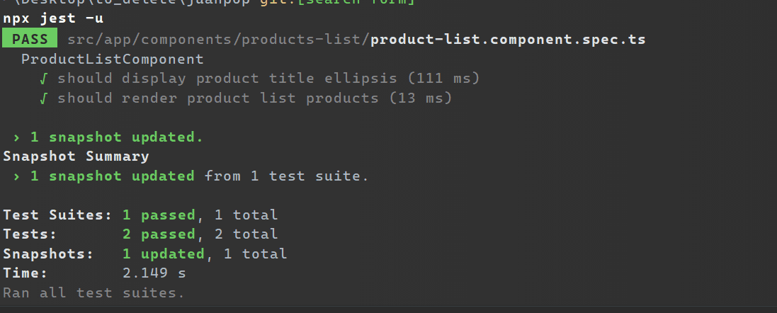 If everything looks as expected, then I can update the snapshots by running Jest with -u.