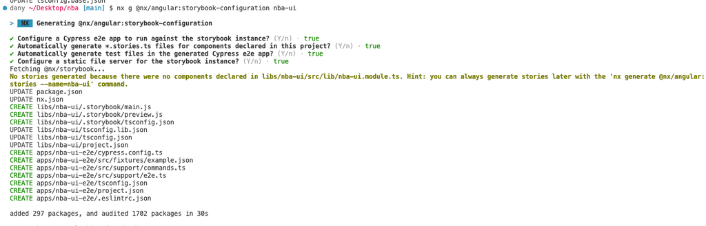 nx g @nx/angular:storybook-configuration nba-uiIt will ask if you want to configure Cypress to run against the Storybook instance or generate stories from our components in the library, saving a lot of time.