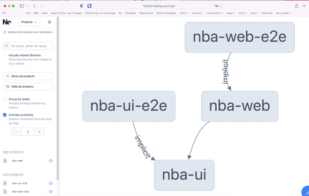 Nx provides the nx graph command, which visually displays how the projects are related easily.