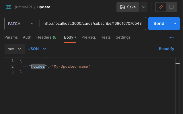 Take the ID and send a PATCH request to cards/subscribe/yourid endpoint, in the body, send the new holder name: