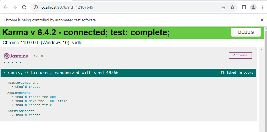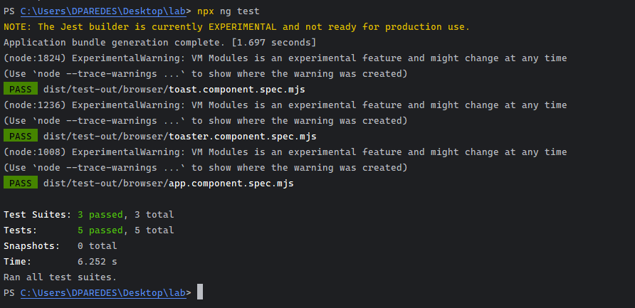 }Save the changes and run the command ng test again, using Jest as the default test runner for Angular (experimental).