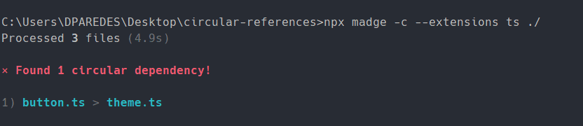 }Yeah! Our app works as expected, but wait a minute. Did you see theme.ts requires button.ts and button.ts uses theme.ts?