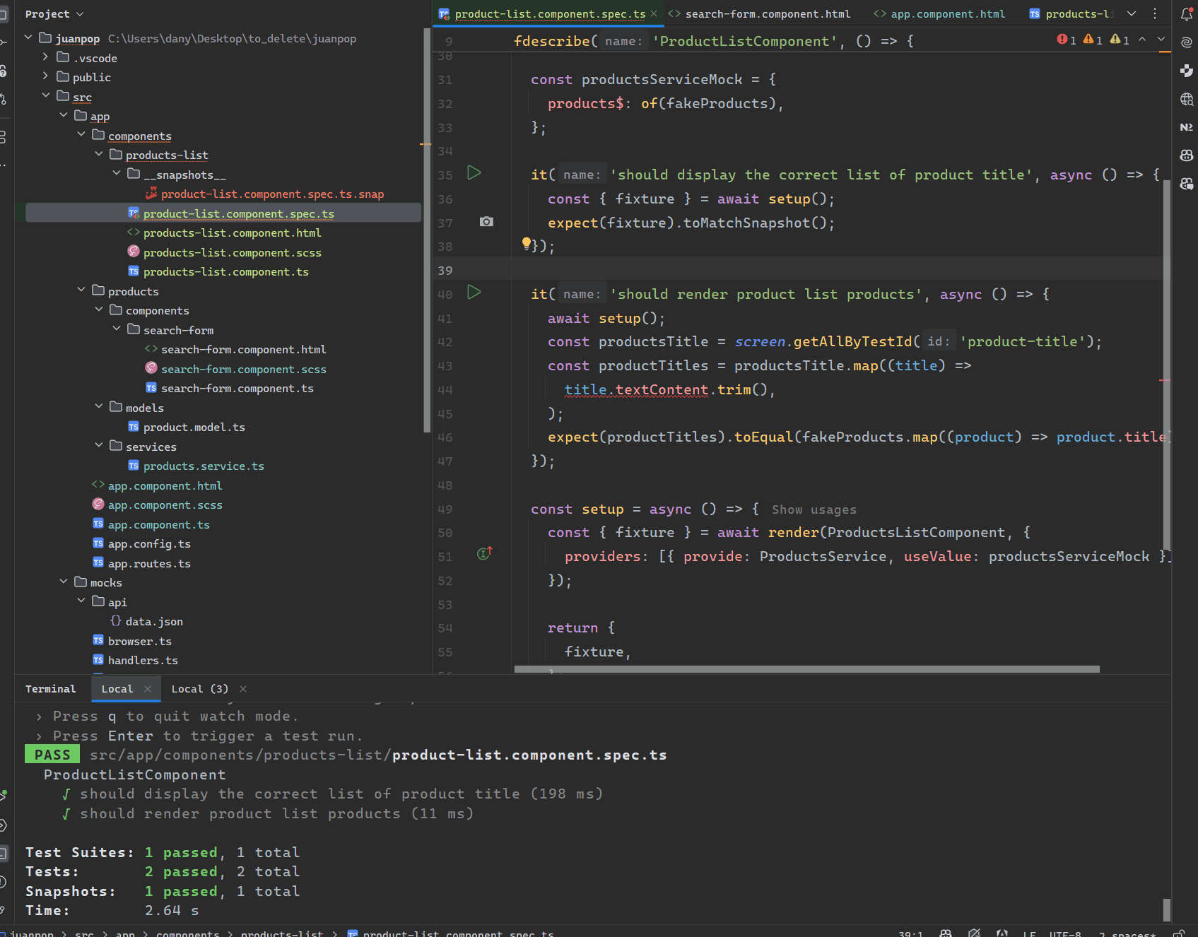 After execution, an __snapshots__ the directory was created next product-list.component.spec.ts