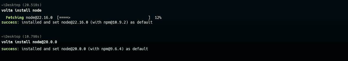 success: pinned node@22.16.0 (with npm@10.9.2) in package.jsonNow, when I move between projects, the Node version switches automatically like magic! It also supports switching from npm to yarn.